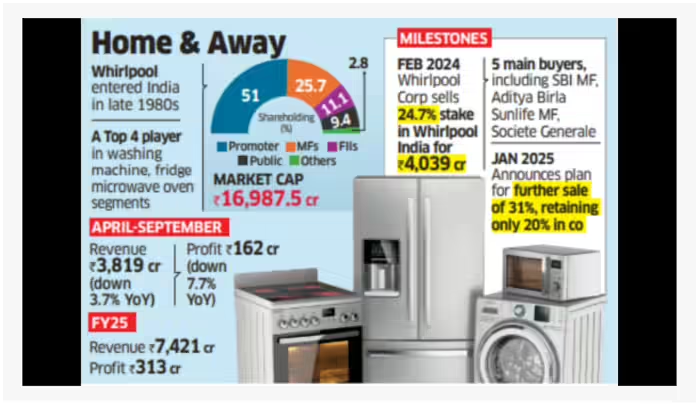 If negotiations with Advent also fail, the company may consider selling some of its equity through a block deal. Whirlpool India shares have fallen 26% so far this year. The company’s recent results show its lowest revenue in the last seven quarters, indicating operational challenges in India. Although sales in the US increased 1% in the third quarter, profits declined due to a non-cash loss.